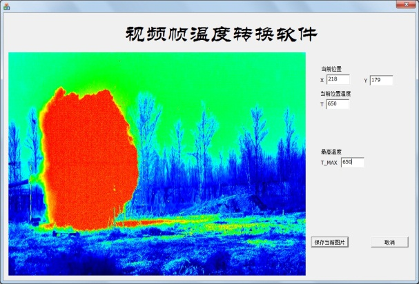 1280×800 采集时长 ≥10s 可按用户要求配置滤光镜,以防敏感器件饱和 高速摄像测温软件读取保存于计算机的视频文件,通过选取不同帧下的图像,软件自动计算当前图像RGB值对应的温度。在软件中,可以在图像显示区域中选中某一点点击,选中某一像素,在对话框右侧显示当前像素的位置,当前位置温度显示的是当前像素经过温度转换之后的温度值。最高温度文本框中显示的整幅图像中最高温度值的数值大小。